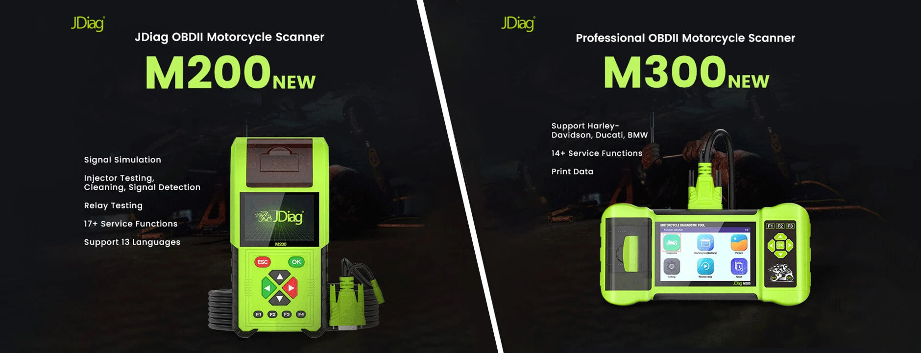 JDiag M200 Motorcycle obd 2 scanner, Motorcycle system diagnostic & battery tester, WiFi 2.4GHz, Injector Test/Clean/Signal Detection, Relay Test